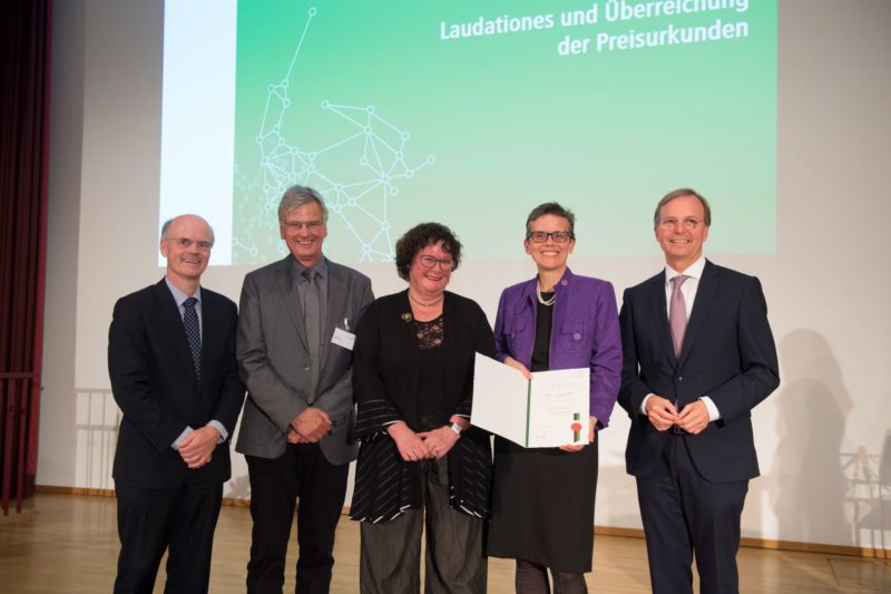 Left to right: Enno Aufderheide (Secretary General, Humboldt Foundation); Jan Louis (Vice-President, Hamburg University); Ingrid Gogolin; Ingrid Piller; Thomas Rachel (State Secretary, Ministry of Education and Research) (Image: Humboldt-Stiftung/Jens Jeske)