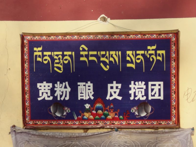A restaurant sign featuring both Tibetan and Chinese, in a village where the Tibetan residents speak Ngandehua, one of Tibet’s minority languages (Image: Gerald Roche)