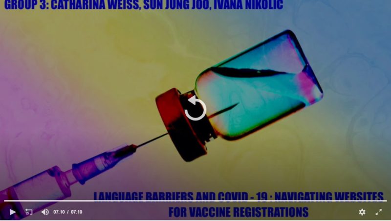 At the same time, the COVID-19 pandemic also provided the context in which to explore questions of education and social participation in linguistically diverse societies. All participants undertook group research projects devoted to the language challenges of the pandemic. Drawing on resources available in the Language on the Move COVID-19 archives, they produced videos about their findings, as in this example. Here, participants Catharina Weiss, Sun Jung Joo, and Ivana Nikolic examined official vaccination registration websites in Australia, Germany, and Serbia to see how accessible they are to residents with limited or no proficiency in English, German, or Serbian.