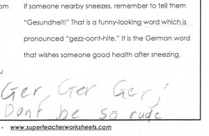 Earlier this term I intercepted a note my 7-year-old had written to her teacher: “Ger Ger Ger; Don’t be so rude.” She was objecting to a reading comprehension exercise about sneezing, which included the following information: