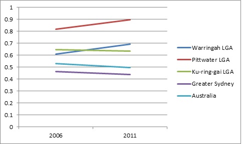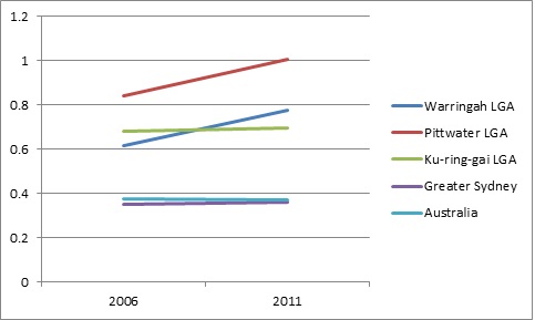 To begin with, as Figure 1 shows, the percentage of residents born in Germany increased in both Warringah and Pittwater between 2006 and 2011. For Ku-ring-gai it remained virtually unchanged. These figures are in contrast to those for Greater Sydney and Australia as a whole where the percentage of residents born in Germany slightly decreased during the same period.