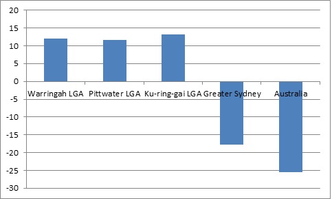 Second, the figures for German as a home language show the same tendencies but the changes are more pronounced (Figure 2). This means that there were markedly more residents who spoke German at home in Warringah and Pittwater in 2011 than in 2006.