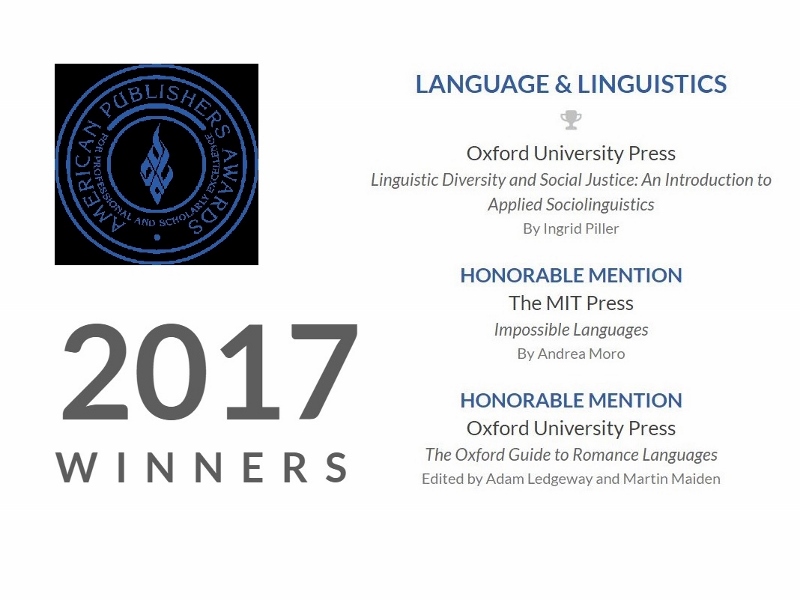 Language on the Move is finally back from our summer break. The New Year has started well for us with exciting news that Ingrid Piller’s Linguistic Diversity and Social Justice (Oxford University Press, 2016) has won the 2017 Prose Award in the “Language and Linguistics” category. The Prose Awards are presented by the American Association of Publishers and have been recognizing “the very best in professional and scholarly publishing by bringing attention to distinguished books, journals, and electronic content” since 1976.