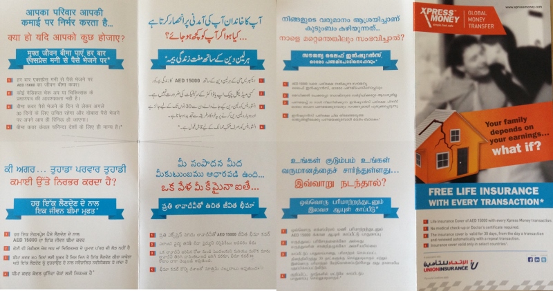 Multillingual money transfer ad in English, Hindi, Bangla, Urdu, Telugu, Malayalam and Tamil