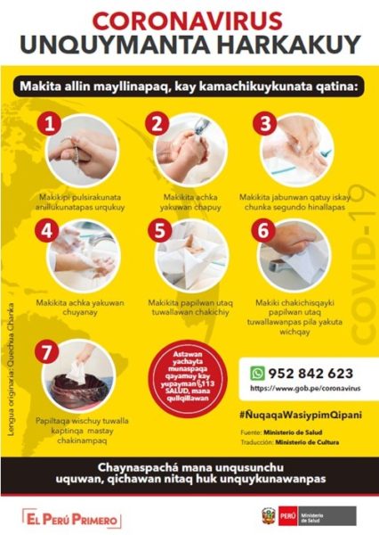 Los afiches de prevención contra el COVID-19 lo muestran así. En la infografía al quechua chanka aparece un hashtag que se traduce al español como “me quedo en casa”, un número de celular para enviar mensajes instantáneos y un número telefónico de servicio gratuito implementado por el Ministerio de Salud para cualquier consulta.