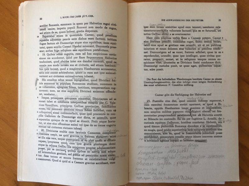 This kind of language learning distraction happens extremely rarely to me in English and German, the two languages in which I am highly literate. However, it is very familiar from other languages I read with less fluency. The images show pages from my copy of Caesar’s Gallic War in Latin, which I read as a high school student. Given the copious notes on grammar and vocabulary my younger self left between the lines and in the margins, it must have been difficult to focus on the content. And it certainly was a slow read – the way I remember it, reading Gallic War took up most of Year 9.