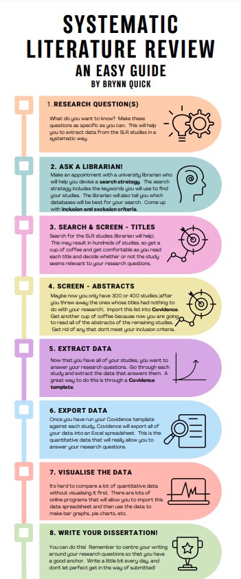 And so, I created this “SLR: Easy Guide” explainer for anyone and everyone who would like to conduct an SLR but has no idea where to start. If that’s you, please feel free to use this resource – and know that you aren’t alone as an early researcher who is learning things for the first time. We’ve all got to start somewhere, and we can make it easier on others by sharing what we’ve figured out the hard way!