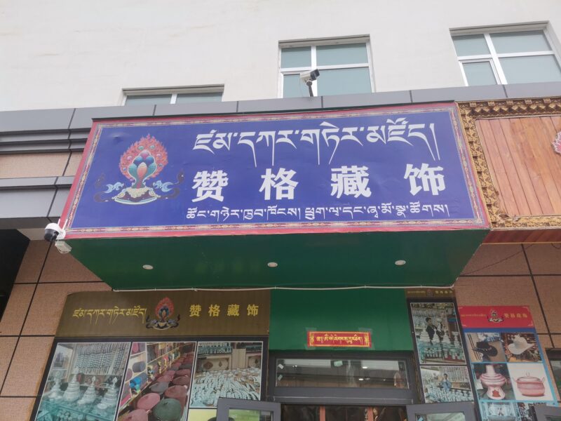 Rongwo is also home to local businesses, often related to restaurants, clothing, religious paraphernalia, and thangka art. In these shops, we observe a more balanced visual representation of Tibetan and Chinese, suggesting that making Tibetan more visible positively impacts their commercial activity. Moreover, Tibetan serves as the source language, as evidenced by terms that refer to Tibetan landscape and philosophical-religious tradition.
