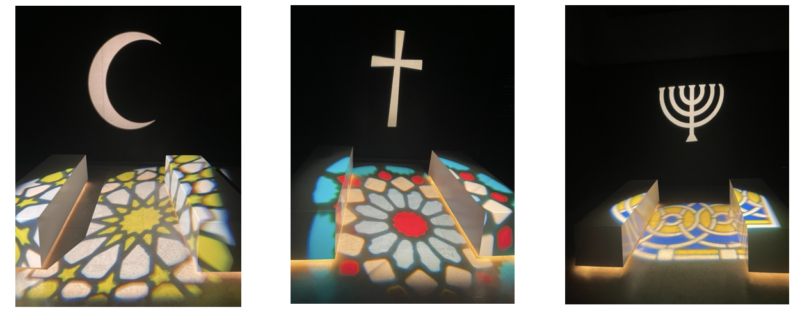As we headed back to the Forum from the gardens, we witnessed an interesting lingua-cultural turn in relation to the signage in one of the darkened rooms. Each corner of the room was lit up in turn by a gobo, with a crescent representing Islam, a cross for Christianity, and a menorah symbolizing Judaism (Figure 4).