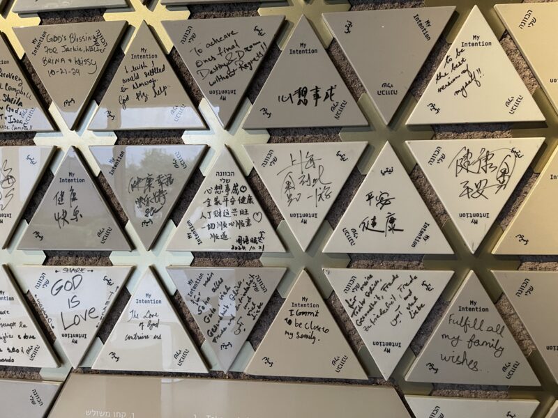 Having explored the three places of worship and experienced the immersive light show (Figure 4), we came across a wall of tessellating triangles, again speaking to the significance of the number three: three languages, three religions, and echoing the shape of the simple triangular fountains found throughout the complex. We quickly realized that the purpose of this ‘wall of intentions’ was for visitors to write their own messages of intention. From 120 messages on the wall, we could understand the 60 messages written in English, eight in French, five in German, four in Spanish and one in Italian. A further six were written in Arabic, 25 in East Asian languages, and 18 others which we have yet to fully translate. Pictures appeared on 24 of the messages in addition to text, with only one intention including a picture without words, which was three people holding hands together, symbolizing togetherness.