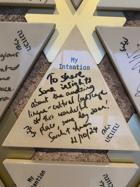 Although the wall of intentions is temporary with today’s intentions being different from tomorrow’s, a major takeaway on the day we visited, October 21, 2024, was the focus on love, peace, the world, and family, rather than on religion itself. There is no doubt that further analysis which includes specific and detailed translations will reveal more nuanced truths, but that’s for another day. Suffice to say that there is a lot to get excited about in this multi-faith, multilingual and interculturally rich space. As our hand-written intention states (Figure 6), we plan to delve deeper into this rich landscape and add to the growing research on religious linguistic landscapes and semiotic religious landscapes in the Arab Gulf States and beyond.