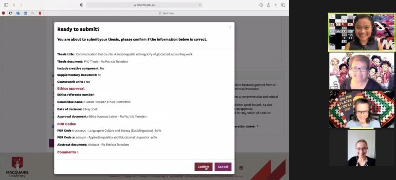 Your submission is a big achievement and a great happiness for everyone who supported you; so congratulations to your supervisors Prof. Ingrid Piller and Dr. Loy Lising.