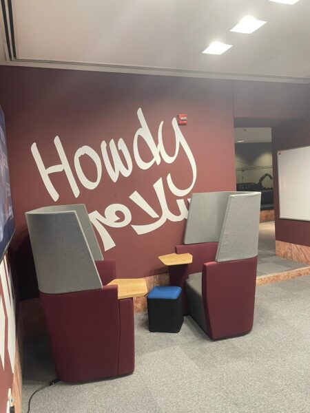 Walking into the Texas A&M University at Qatar (TAMUQ) building today feels different from just a year ago. As part of an ongoing project, several students and I (Sara) have been documenting the visual and linguistic changes taking place across the TAMUQ building in Education City, Qatar. The university’s traditional greeting Howdy, its maroon banners, and the familiar Aggie insignia (the shared nickname and identity of Texas A&M students and alumni) are still visible, yet they are beginning to lose their dominance. In their place, visitors are now welcomed by new blue-and-white signs displaying a translingual message: “Hayakom at HBKU.” The Gulf Arabic word hayakom, meaning “welcome,” has become increasingly prominent on posters, banners, and orientation booths. Although much of this signage is not yet permanently installed, the shift is already evident.