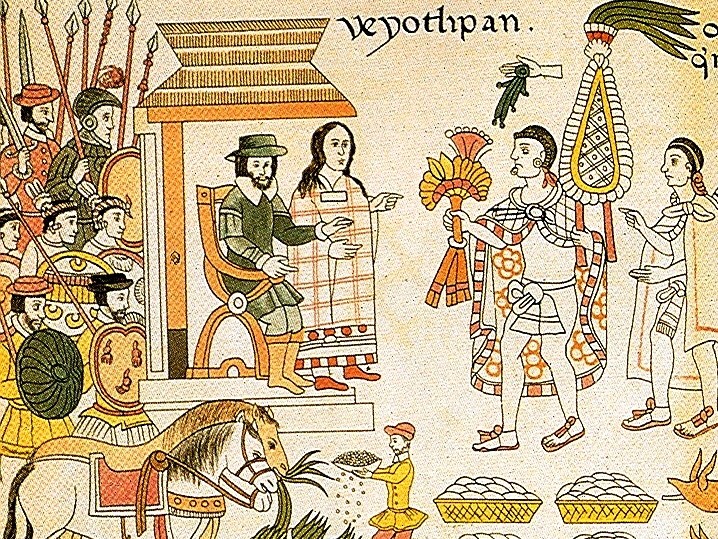 Malinche mediating between the Spanish and the Americans (Source: Lienzo de Tlaxcala, mid 16th c)