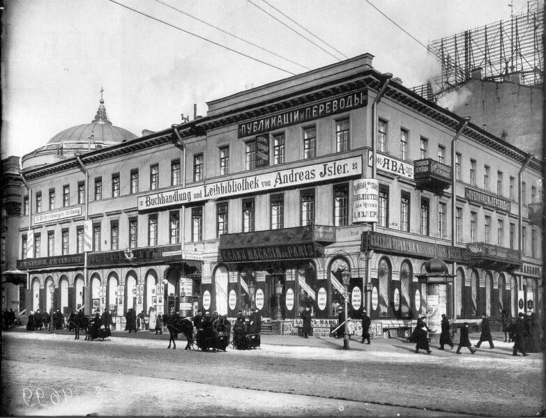 Nevsky Prospect 20, St Petersburg, with Russian signs, German signs for St Petersburger Zeitung, the German bookstore and library of Andreas Isler, and a French sign for the Grand Magasin de Paris (ca. 1900)