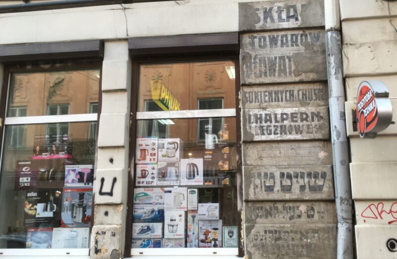 Ads in Polish and Yiddish for Halpern’s fabric store and warehouse, Skład towarów bławatnych, on Nalyvaiko street, 13 (at the turn of the 20th century the street – then known as Rzeżnicka – was inhabited primarily by Jews). Lviv, September 2019. Photo by A. Pavlenko