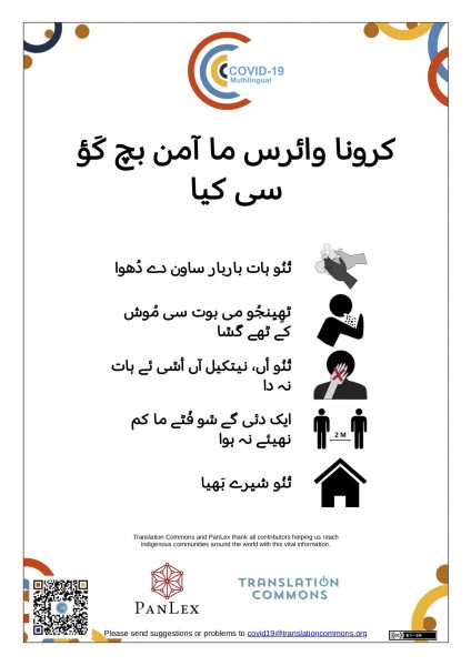 Conventional translation work pivots on the message itself: this message-centered approach is based on a high degree of control of the source message and of the type of translation—i.e. verbatim translation—aimed to obtain an output that can be created easily and diffused quickly. A typical example is the “do the 5″ poster model that Translation Commons has promoted. More than 10% of the languages in the ELP repository have a “do the 5 poster” as their only COVID-19 health information resource.