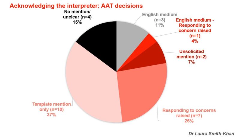 In the decisions where it was clear that an interpreter was present, more than half only have generic, copy-paste template sort of statements about them, for example “The Tribunal hearing was conducted with the assistance of an interpreter in the Punjabi and English languages.”